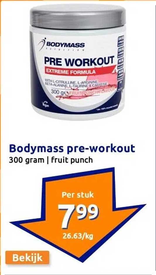 Ontdek de geweldige Bodymass Pre-Workout aanbieding in de nieuwste Action folder. Naast deze aanbieding vind je nog veel meer aantrekkelijke kortingen. Je kunt de Bodymass Pre-Workout eenvoudig online bestellen via de Action website of kopen in een winkel bij jou in de buurt.