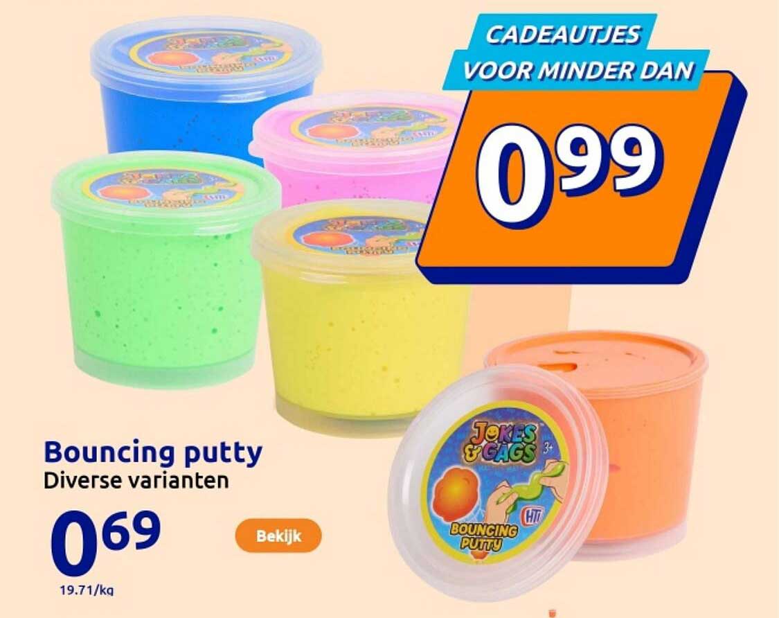 Bekijk nu de Bouncing putty Diverse varianten aanbieding in de Action folder. Deze aanbieding is geldig van 01-10-2025 tot en met 07-10-2025.