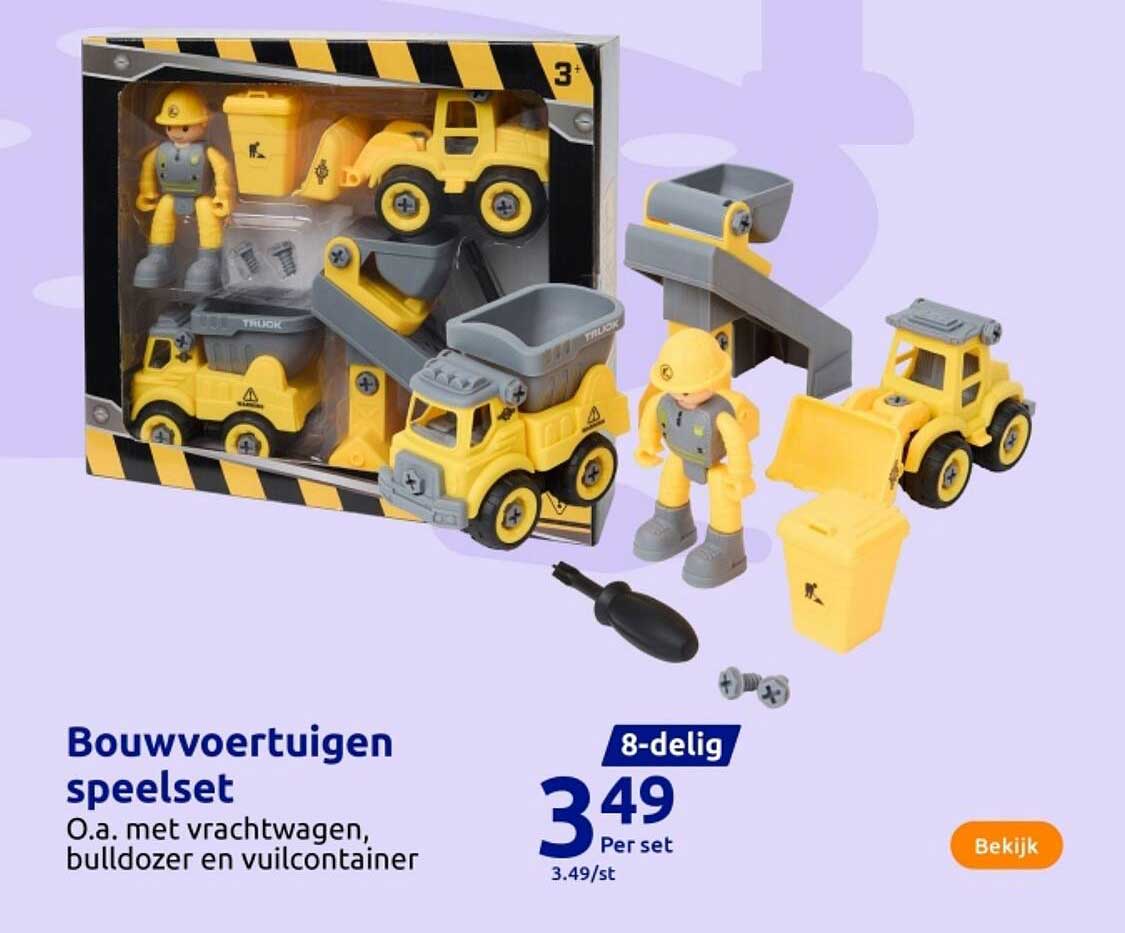 Bekijk nu de Bouwvoertuigen speelset aanbieding in de Action folder. Deze aanbieding is geldig van 16-10-2024 tot en met 22-10-2024.