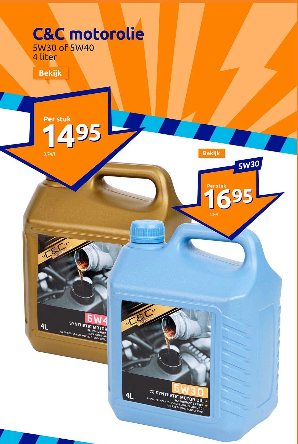Bekijk de C&C Motorolie 5W30 Of 5W40 aanbieding bij Action! Deze fantastische aanbieding is nu beschikbaar in de nieuwste Action folder. Profiteer van deze kans en bespaar flink op je aankoop.
