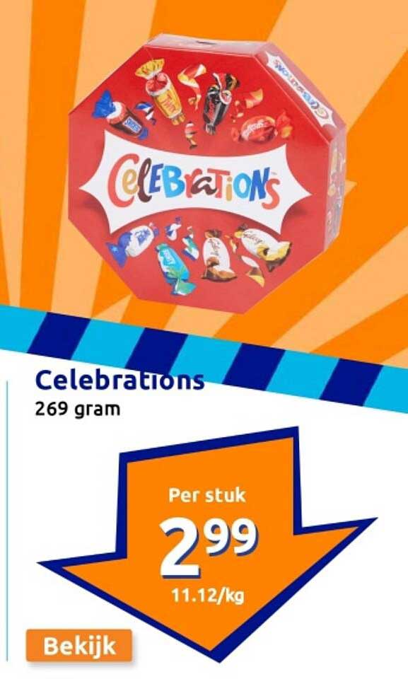 Ontdek de geweldige Celebrations aanbieding in de nieuwste Action folder. Naast deze aanbieding vind je nog veel meer aantrekkelijke kortingen. Je kunt de Celebrations eenvoudig online bestellen via de Action website of kopen in een winkel bij jou in de buurt.