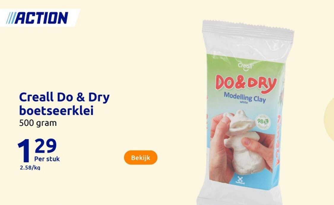 Ontdek de geweldige Creall Do & Dry Boetseerklei aanbieding in de nieuwste Action folder. Naast deze aanbieding vind je nog veel meer aantrekkelijke kortingen. Je kunt de Creall Do & Dry Boetseerklei eenvoudig online bestellen via de Action website of kopen in een winkel bij jou in de buurt.