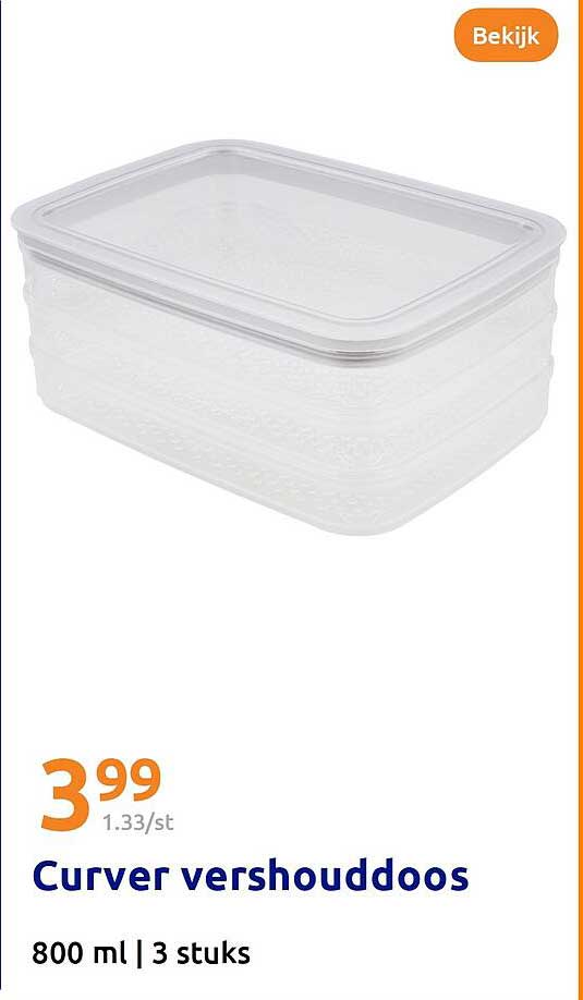 Ontdek de geweldige Curver Vershouddoos aanbieding in de nieuwste Action folder. Naast deze aanbieding vind je nog veel meer aantrekkelijke kortingen. Je kunt de Curver Vershouddoos eenvoudig online bestellen via de Action website of kopen in een winkel bij jou in de buurt.
