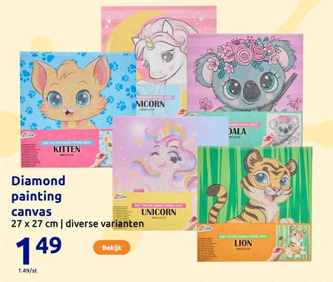 Bekijk nu de Diamond painting canvas 27 x 27 cm | diverse varianten aanbieding in de Action folder. Deze aanbieding is geldig van 05-11-2025 tot en met 11-11-2025.
