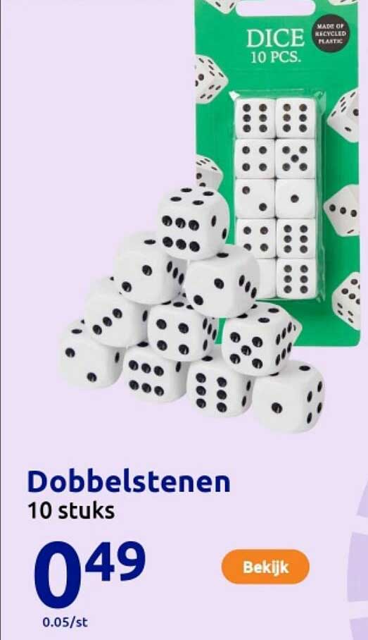 De normale prijs voor een set dobbelstenen valt vaak hoger uit, maar bij Action betaal je slechts €0,49. Dit betekent dat je voor minder dan een euro 10 dobbelstenen in handen hebt, waardoor het een ongelooflijk waardevolle aanbieding is. Waarom zou je meer betalen als je voor deze prijs zoveel kunt krijgen?