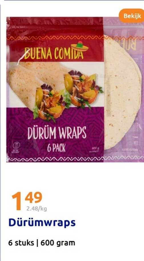 Op zoek naar een smakelijke en veelzijdige basis voor je maaltijd? Deze Dürümwraps van Buena Comida zijn de perfecte keuze! Ideaal voor zowel een snelle hap als een uitgebreide maaltijd. Met een aanbieding zoals deze kan je nu extra genieten zonder je portemonnee te zwaar te belasten. Perfect voor een gezellige avond met vrienden of een snelle lunch tijdens een drukke werkdag.