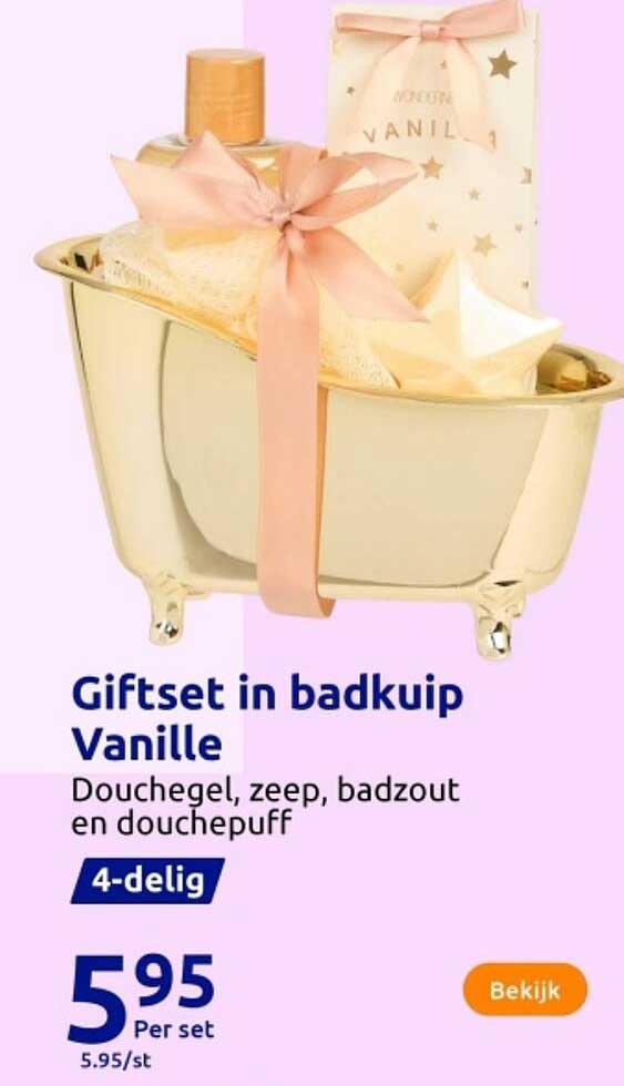 Bekijk nu de Giftset in badkuip Vanille aanbieding in de Action folder. Deze aanbieding is geldig van 23-10-2024 tot en met 29-10-2024.