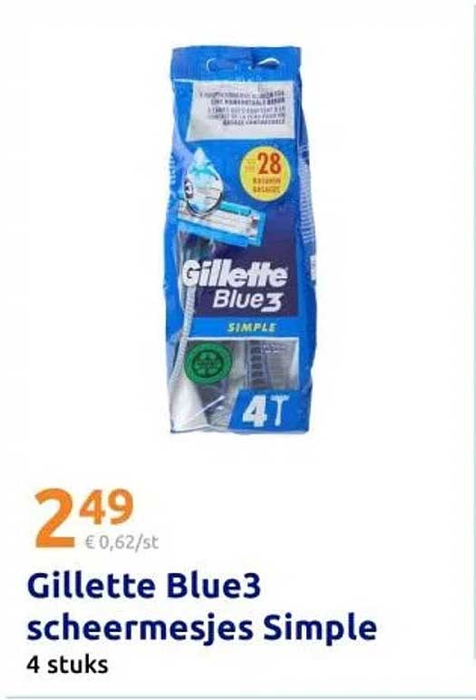 Bekijk de Gillette Blue3 Scheermesjes Simple aanbieding bij Action! Deze fantastische aanbieding is nu beschikbaar in de nieuwste Action folder. Profiteer van deze kans en bespaar flink op je aankoop.