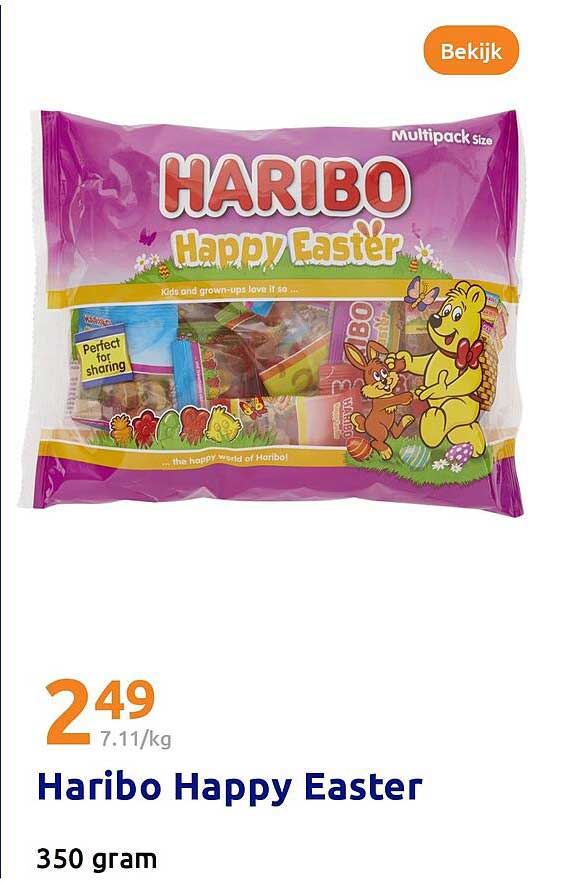 Welkom bij een zoete verrassing van Action! De Haribo Happy Easter is een perfect geschenk voor de paastijd. Dit multipack van 350 gram zit boordevol heerlijke gummies die niet alleen kinderen, maar ook volwassenen blij maken. Met een mix van smaken en vormen is dit product ideaal voor in de paaseieren of om simpelweg van te genieten tijdens een gezellige bijeenkomst met vrienden en familie.