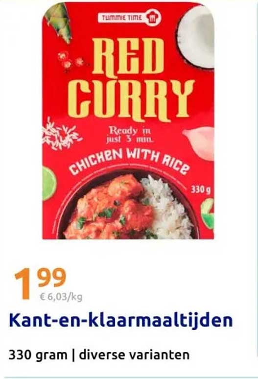 Als je op zoek bent naar een snelle en smakelijke maaltijd, dan is deze aanbieding uit de Action-folder precies wat je nodig hebt. De kant-en-klaarmaaltijden zijn ideaal voor drukke dagen waarop je geen tijd hebt om te koken, maar toch wilt genieten van een heerlijke maaltijd. Met de Red Curry, die binnen slechts 3 minuten klaar is, hoef je geen compromissen te sluiten als het gaat om smaak en gemak.