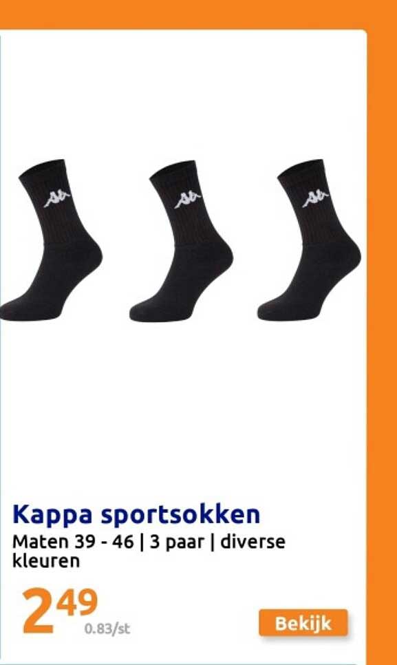 Bekijk de Kappa Sportsokken aanbieding bij Action! Deze fantastische aanbieding is nu beschikbaar in de nieuwste Action folder. Profiteer van deze kans en bespaar flink op je aankoop.