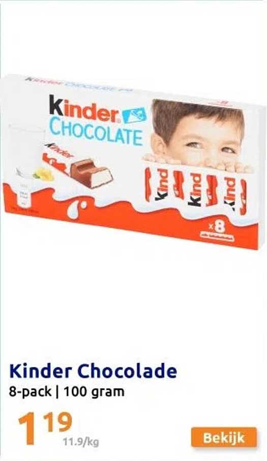 Ontdek de geweldige Kinder Chocolade aanbieding in de nieuwste Action folder. Naast deze aanbieding vind je nog veel meer aantrekkelijke kortingen. Je kunt de Kinder Chocolade eenvoudig online bestellen via de Action website of kopen in een winkel bij jou in de buurt.