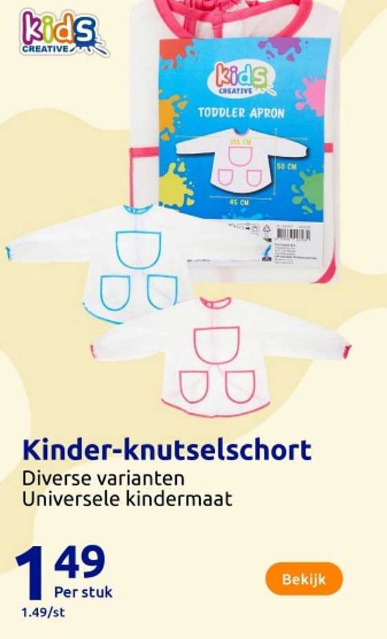 Bekijk de Kinder-Knutselschort aanbieding bij Action! Deze fantastische aanbieding is nu beschikbaar in de nieuwste Action folder. Profiteer van deze kans en bespaar flink op je aankoop.