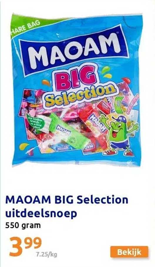 Bekijk de Maoam Big Selection Uitdeelsnoep aanbieding bij Action! Deze fantastische aanbieding is nu beschikbaar in de nieuwste Action folder. Profiteer van deze kans en bespaar flink op je aankoop.