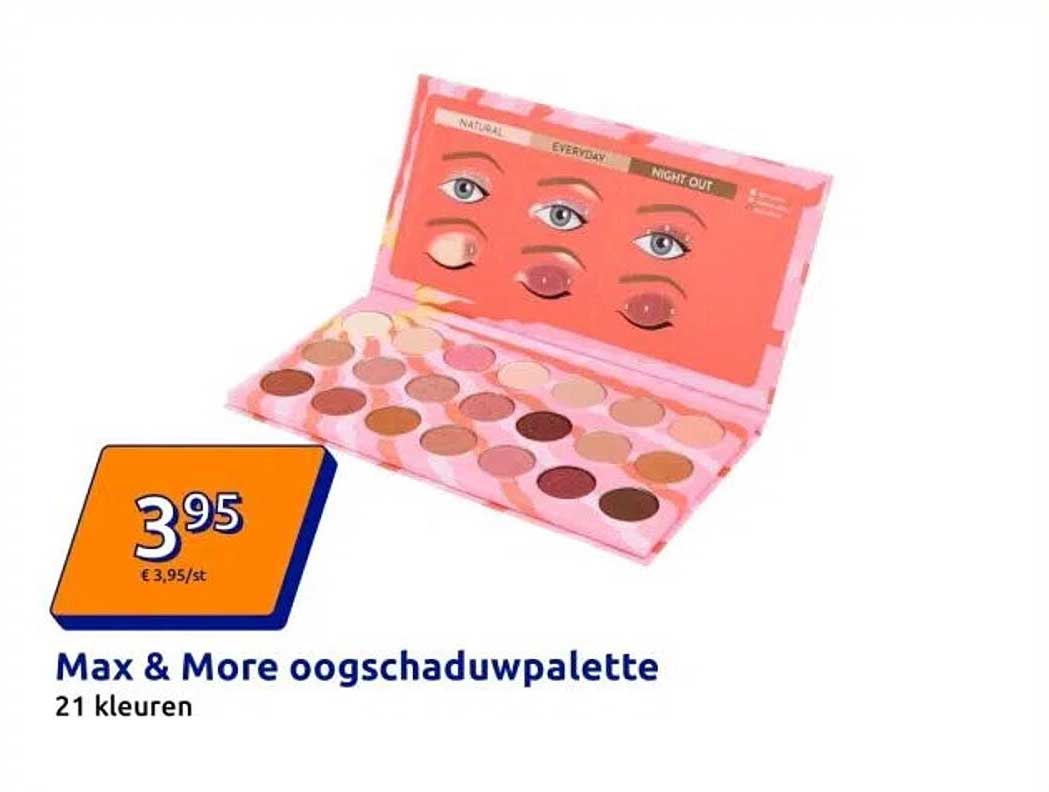 Ontdek de geweldige Max & More Oogschaduwpalette aanbieding in de nieuwste Action folder. Naast deze aanbieding vind je nog veel meer aantrekkelijke kortingen. Je kunt de Max & More Oogschaduwpalette eenvoudig online bestellen via de Action website of kopen in een winkel bij jou in de buurt.