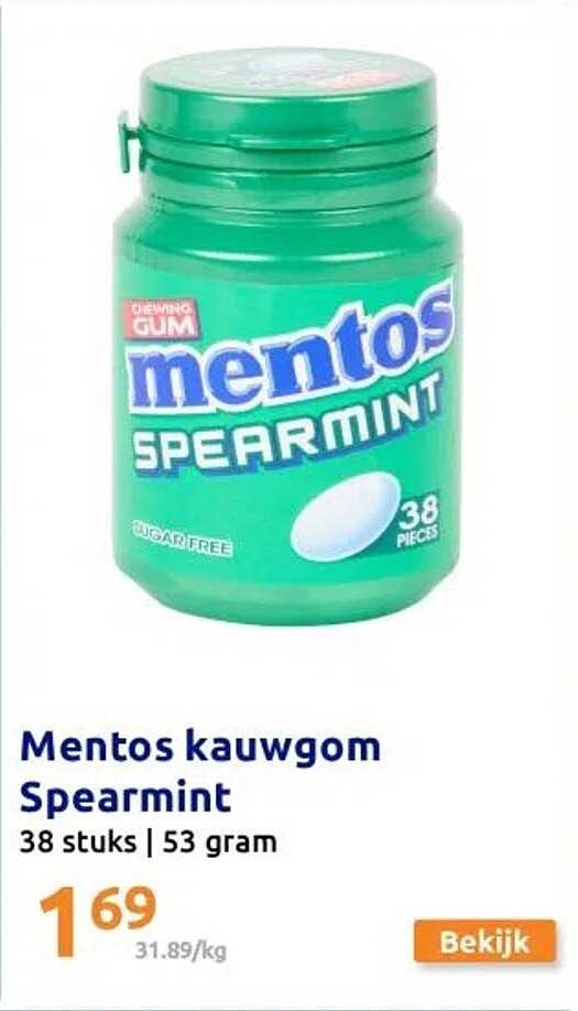 Bekijk de Mentos Kauwgom Spearmint aanbieding bij Action! Deze fantastische aanbieding is nu beschikbaar in de nieuwste Action folder. Profiteer van deze kans en bespaar flink op je aankoop.