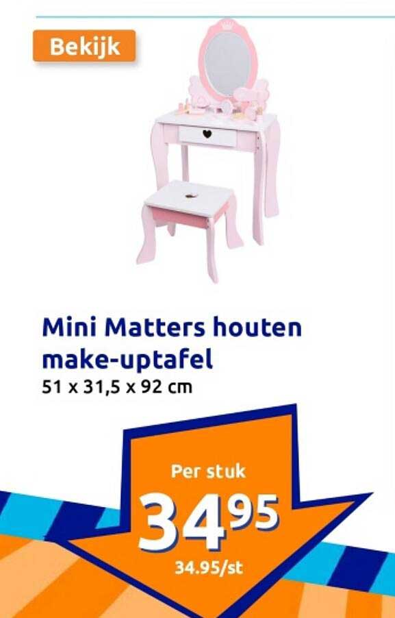 Bekijk de Mini Matters Houten Make-Uptafel aanbieding bij Action! Deze fantastische aanbieding is nu beschikbaar in de nieuwste Action folder. Profiteer van deze kans en bespaar flink op je aankoop.