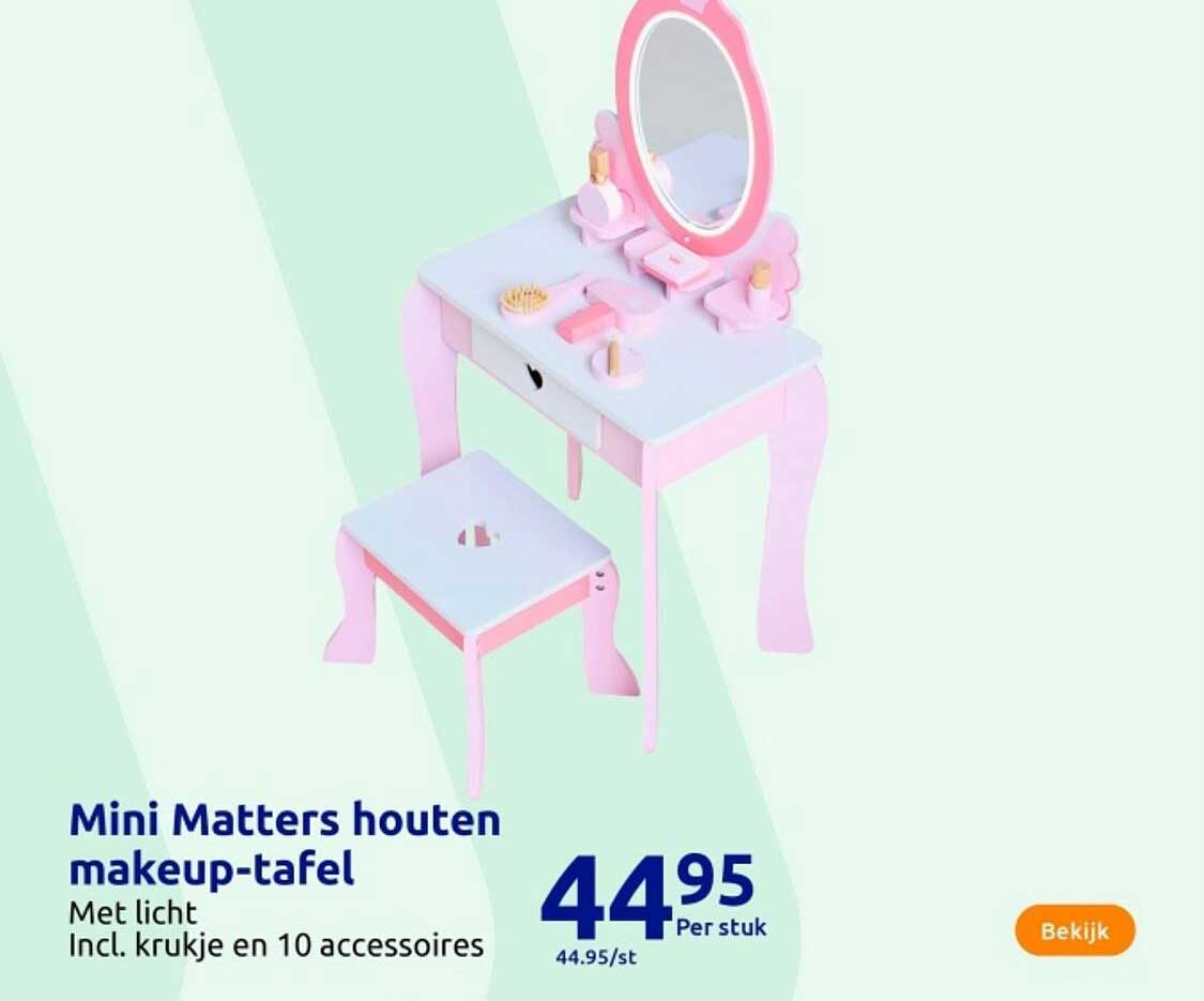 Bekijk de Mini Matters Houten Makeup-Tafel aanbieding bij Action! Deze fantastische aanbieding is nu beschikbaar in de nieuwste Action folder. Profiteer van deze kans en bespaar flink op je aankoop.