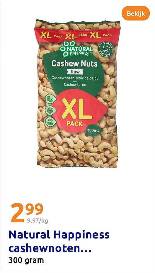 Ontdek de geweldige Natural Happiness Cashewnoten... aanbieding in de nieuwste Action folder. Naast deze aanbieding vind je nog veel meer aantrekkelijke kortingen. Je kunt de Natural Happiness Cashewnoten... eenvoudig online bestellen via de Action website of kopen in een winkel bij jou in de buurt.
