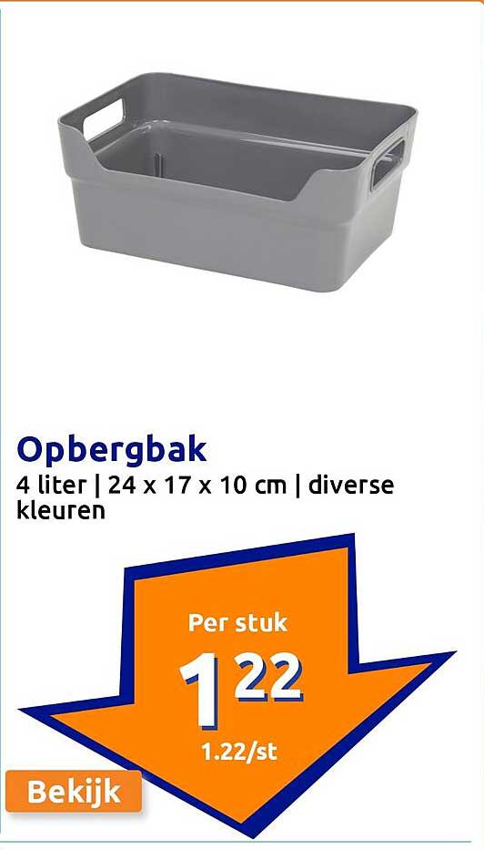 Bekijk de Opbergbak aanbieding bij Action! Deze fantastische aanbieding is nu beschikbaar in de nieuwste Action folder. Profiteer van deze kans en bespaar flink op je aankoop.