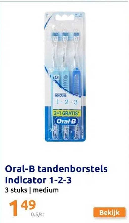 Ontdek de geweldige Oral-B Tandenborstels Indicator 1-2-3 aanbieding in de nieuwste Action folder. Naast deze aanbieding vind je nog veel meer aantrekkelijke kortingen. Je kunt de Oral-B Tandenborstels Indicator 1-2-3 eenvoudig online bestellen via de Action website of kopen in een winkel bij jou in de buurt.
