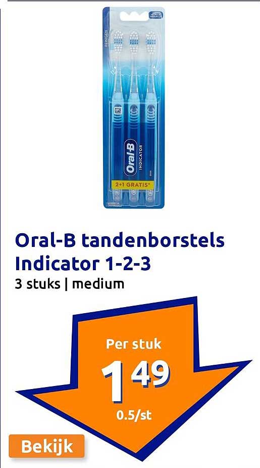 Bekijk de Oral-B Tandenborstels Indicator 1-2-3 aanbieding bij Action! Deze fantastische aanbieding is nu beschikbaar in de nieuwste Action folder. Profiteer van deze kans en bespaar flink op je aankoop.
