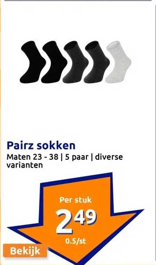 Bekijk de Pairz Sokken aanbieding bij Action! Deze fantastische aanbieding is nu beschikbaar in de nieuwste Action folder. Profiteer van deze kans en bespaar flink op je aankoop.