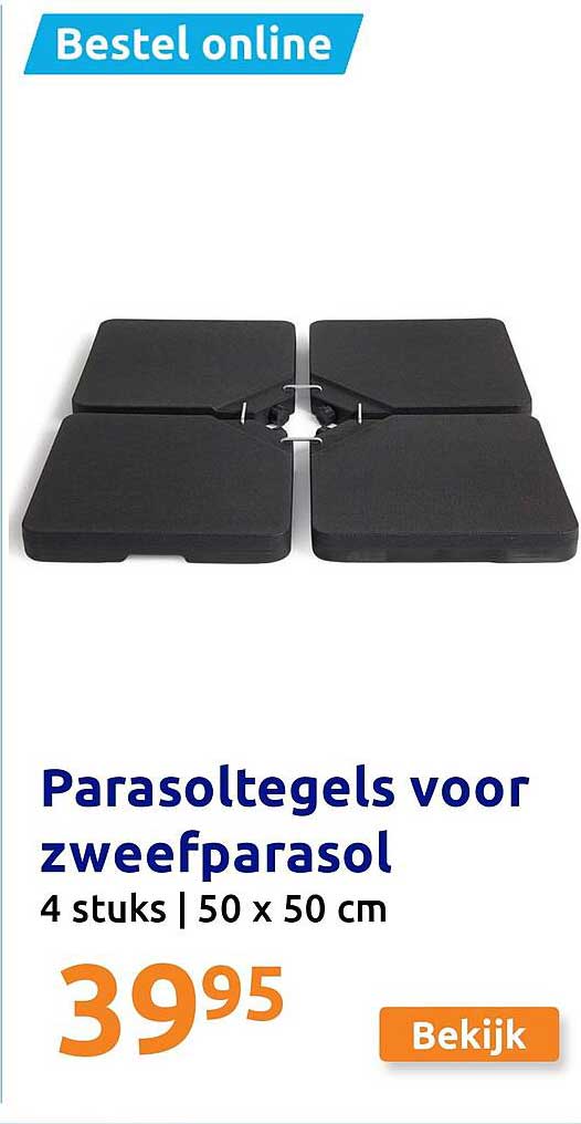 Bekijk de Parasoltegels Voor Zweefparasol aanbieding bij Action! Deze fantastische aanbieding is nu beschikbaar in de nieuwste Action folder. Profiteer van deze kans en bespaar flink op je aankoop.
