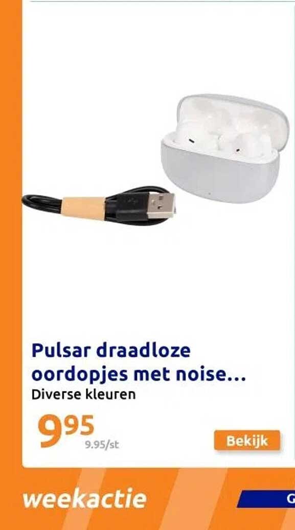 Bekijk de Pulsar Draadloze Oordopjes Met Noise... aanbieding bij Action! Deze fantastische aanbieding is nu beschikbaar in de nieuwste Action folder. Profiteer van deze kans en bespaar flink op je aankoop.