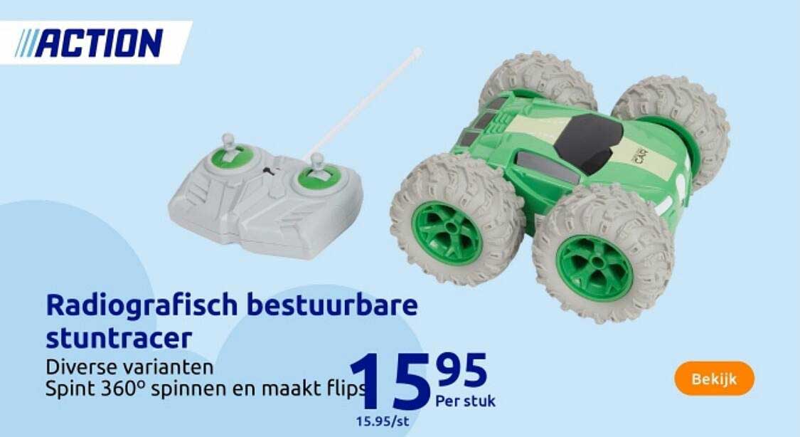 Bekijk de Radiografisch Bestuurbare Stuntracer aanbieding bij Action! Deze fantastische aanbieding is nu beschikbaar in de nieuwste Action folder. Profiteer van deze kans en bespaar flink op je aankoop.