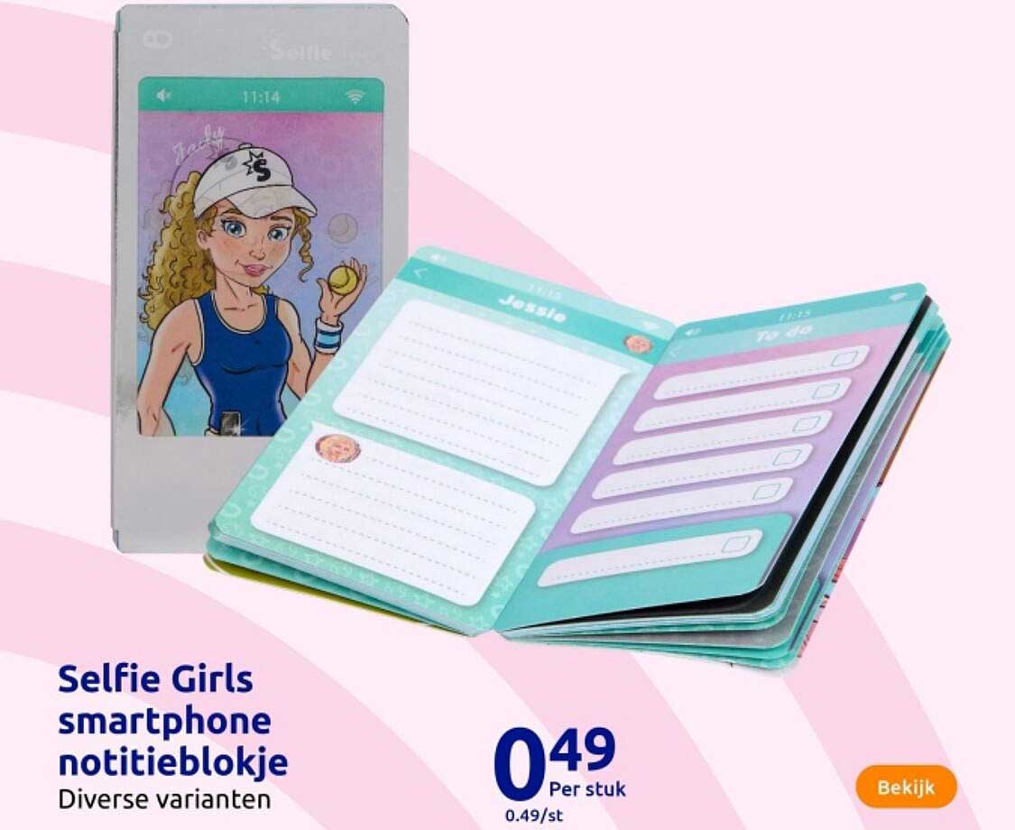 Bekijk de Selfie Girls Smartphone Notitieblokje aanbieding bij Action! Deze fantastische aanbieding is nu beschikbaar in de nieuwste Action folder. Profiteer van deze kans en bespaar flink op je aankoop.