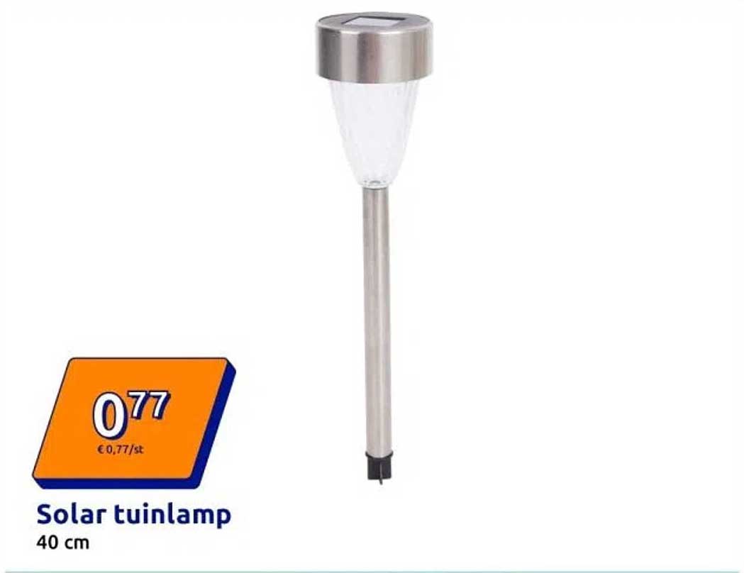 Bekijk nu de Solar tuinlamp 40 cm aanbieding in de Action folder. Deze aanbieding is geldig van 02-04-2025 tot en met 02-04-2025.