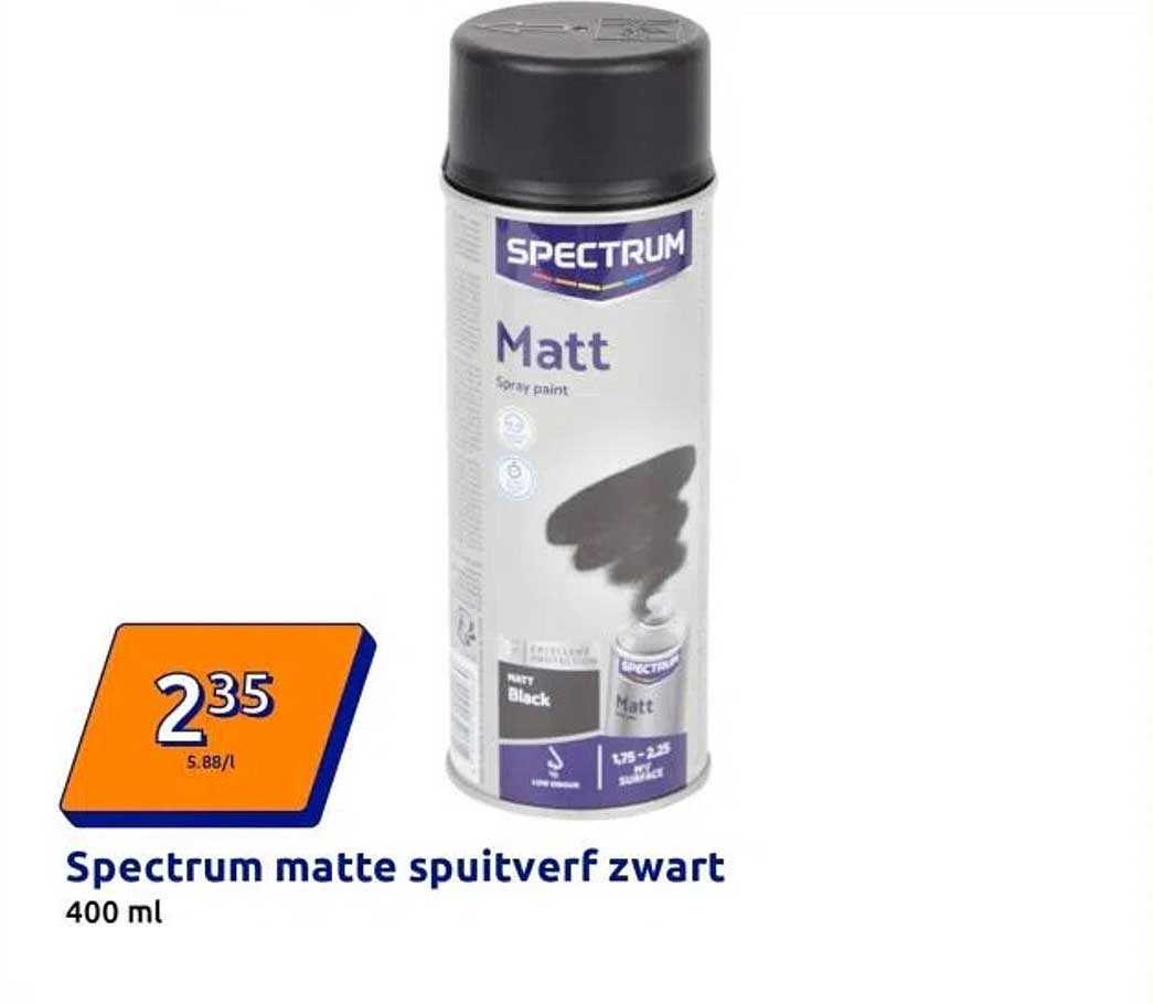 Bekijk nu de Spectrum matte spuitverf zwart 400 ml aanbieding in de Action folder. Deze aanbieding is geldig van 15-10-2025 tot en met 21-10-2025.