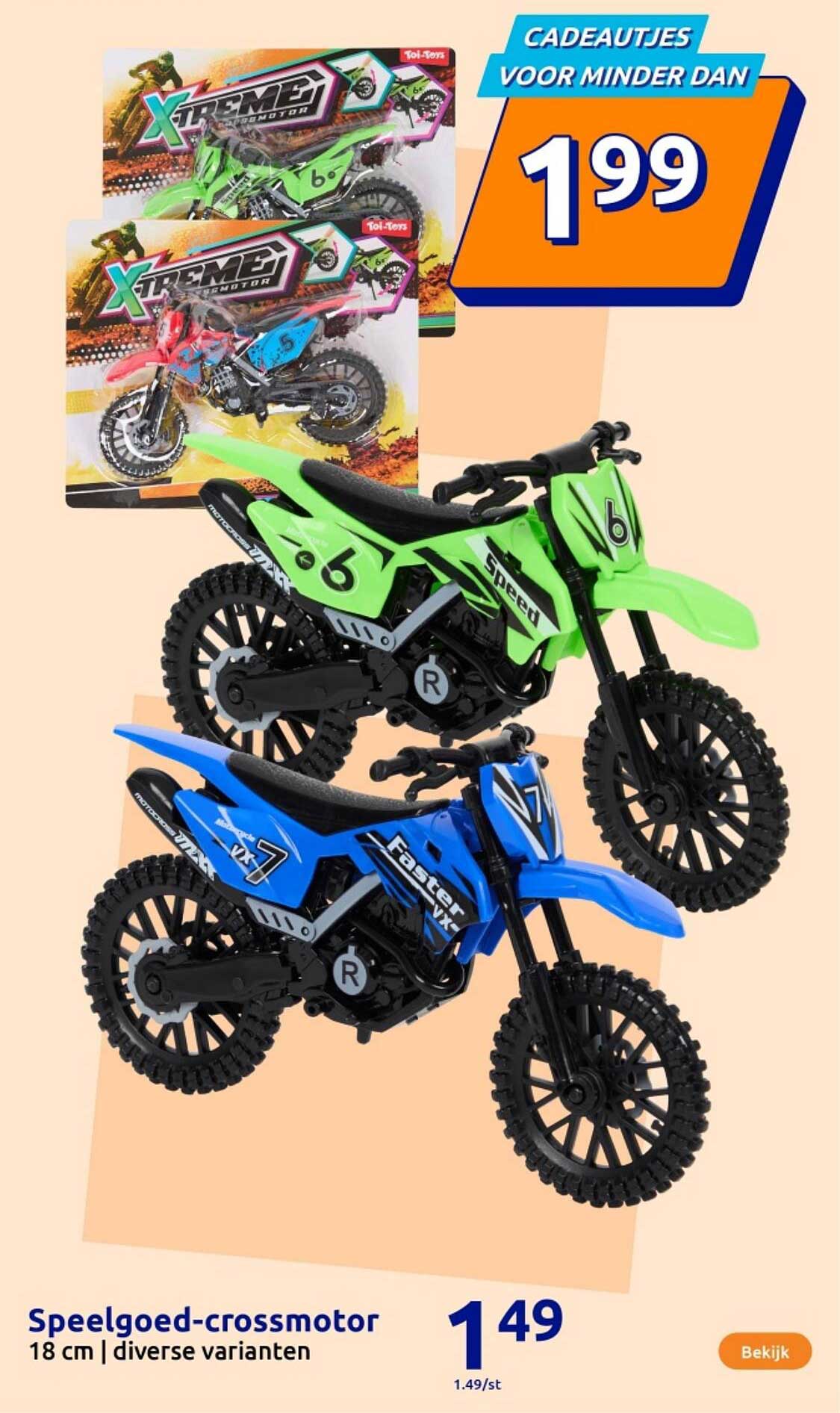Bekijk nu de Speelgoed-crossmotor aanbieding in de Action folder. Deze aanbieding is geldig van 15-10-2025 tot en met 21-10-2025.