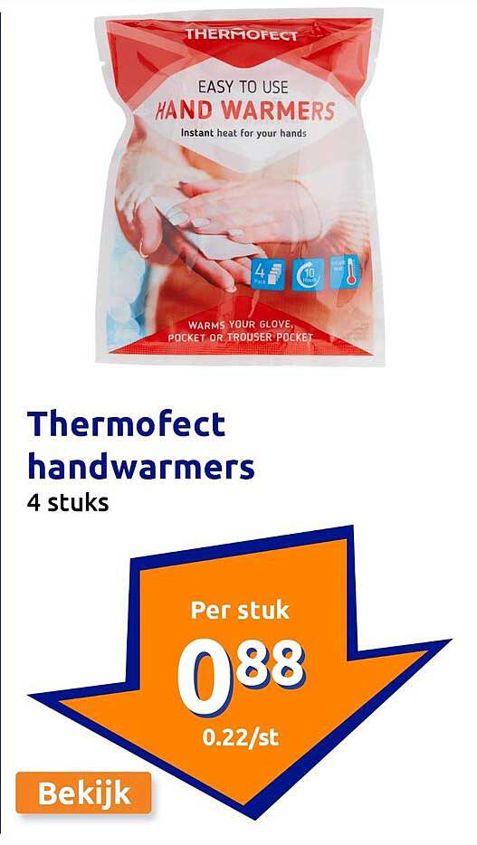 Ontdek de geweldige Thermofect Handwarmers aanbieding in de nieuwste Action folder. Naast deze aanbieding vind je nog veel meer aantrekkelijke kortingen. Je kunt de Thermofect Handwarmers eenvoudig online bestellen via de Action website of kopen in een winkel bij jou in de buurt.