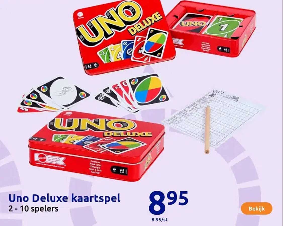 Bekijk nu de Uno Deluxe kaartspel aanbieding in de Action folder. Deze aanbieding is geldig van 08-10-2025 tot en met 14-10-2025.