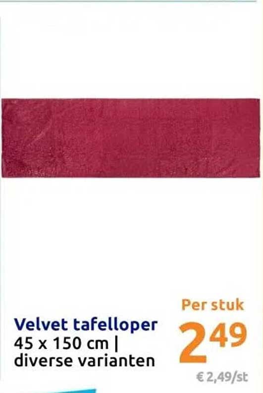 Bekijk de Velvet Tafelloper aanbieding bij Action! Deze fantastische aanbieding is nu beschikbaar in de nieuwste Action folder. Profiteer van deze kans en bespaar flink op je aankoop.