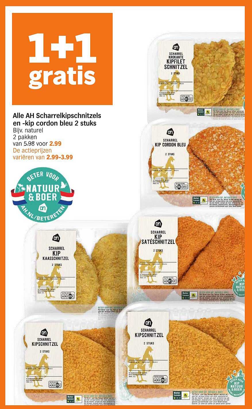 Ontdek de 1+1 Gratis Alle Ah Scharrelkipschnitzels En -Kip Cordon Bleu 2 Stuks