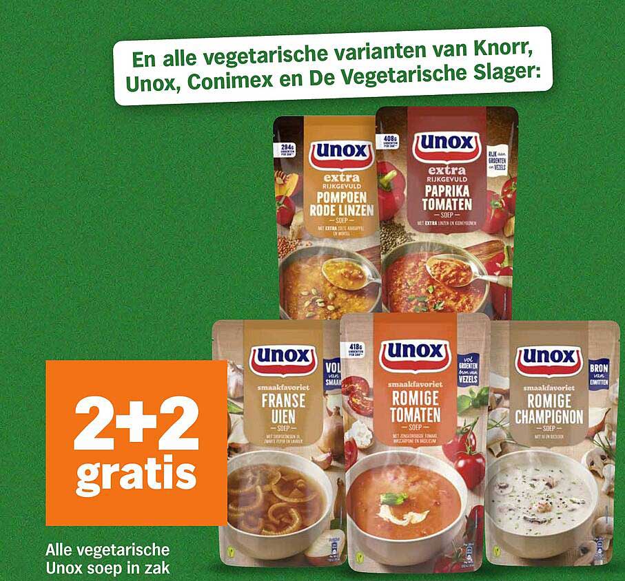Op zoek naar een heerlijke en gemakkelijke manier om te genieten van soep? De aanbieding op deze pagina is perfect voor alle liefhebbers van vegetarische soepen! Met de actie '2+2 gratis' krijg je de kans om verschillende smaken van Unox, Knorr, Conimex en De Vegetarische Slager te proeven. Dit is jouw kans om je voorraad te vullen met smaakvolle soepen die niet alleen lekker, maar ook gezond zijn.