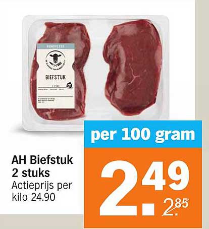Heb je zin in een heerlijk stuk vlees? Dan is deze aanbieding van Albert Heijn echt iets voor jou! De AH Biefstuk komt nu in een aantrekkelijke verpakking van twee stuks, perfect voor een gezellig diner of een barbecue met vrienden. Met een actieprijs van slechts €2,49 per 100 gram is dit een geweldige kans om te genieten van kwaliteitsvlees tegen een gereduceerde prijs. Laat deze aanbieding niet aan je voorbijgaan!