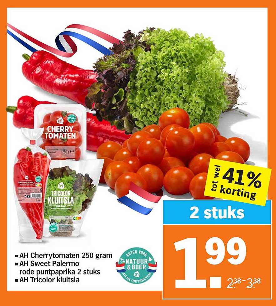 Ben jij op zoek naar verse en smaakvolle groenten voor in je maaltijden? Dan is deze aanbieding echt iets voor jou! De AH Cherrytomaten, AH Sweet Palermo rode puntpaprika en AH Tricolor kluitsla zijn perfect voor een gezonde en kleurrijke salade of als snack tussendoor. Met maar liefst 41% korting is dit een aanbieding die je niet wilt missen!