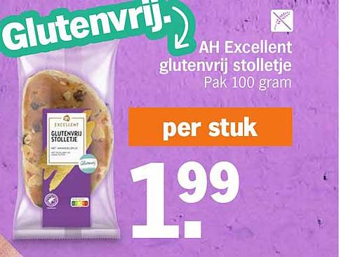 Bekijk nu de AH Excellent glutenvrij stoltetje Pak 100 gram aanbieding in de Albert Heijn folder. Deze aanbieding is geldig van 07-04-2025 tot en met 13-04-2025.