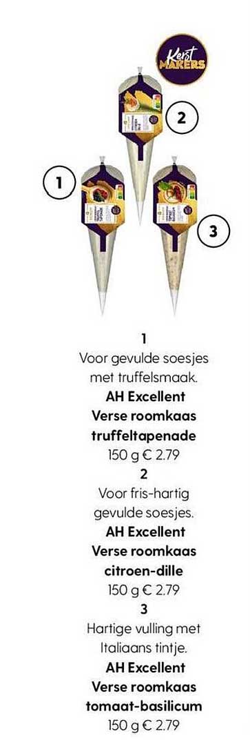 Bekijk nu de AH Excellent Verse roomkaas truffeltapenade AH Excellent Verse roomkaas citroen-dille AH Excellent Verse roomkaas tomaat-basilicum aanbieding in de Albert Heijn folder. Deze aanbieding is geldig van 09-12-2024 tot en met 25-12-2024.