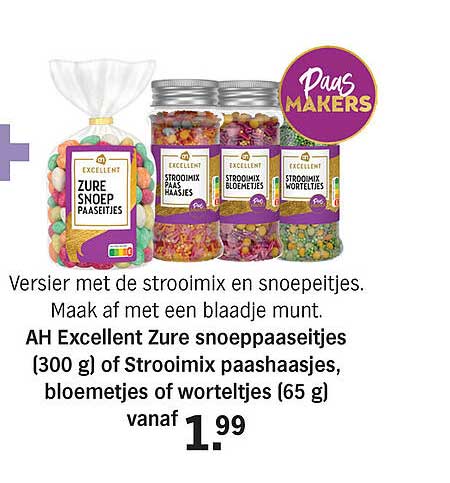 Ben je op zoek naar iets leuks en lekkers voor Pasen? Dan ben je op de juiste plek! De AH Excellent Zure snoeppaaseitjes zijn perfect om je paasfestiviteiten op te vrolijken. Deze kleurrijke snoepjes zijn niet alleen een feest voor het oog, maar ook een genot voor je smaakpapillen. Of je nu een paashaas zoekt om te verstoppen of gewoon wil genieten van een zoete traktatie, deze aanbieding komt goed van pas!