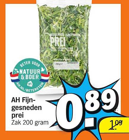 Bekijk de Ah Fijn-Gesneden Prei aanbieding bij Albert Heijn! Deze fantastische aanbieding is nu beschikbaar in de nieuwste Albert Heijn folder. Profiteer van deze kans en bespaar flink op je aankoop.