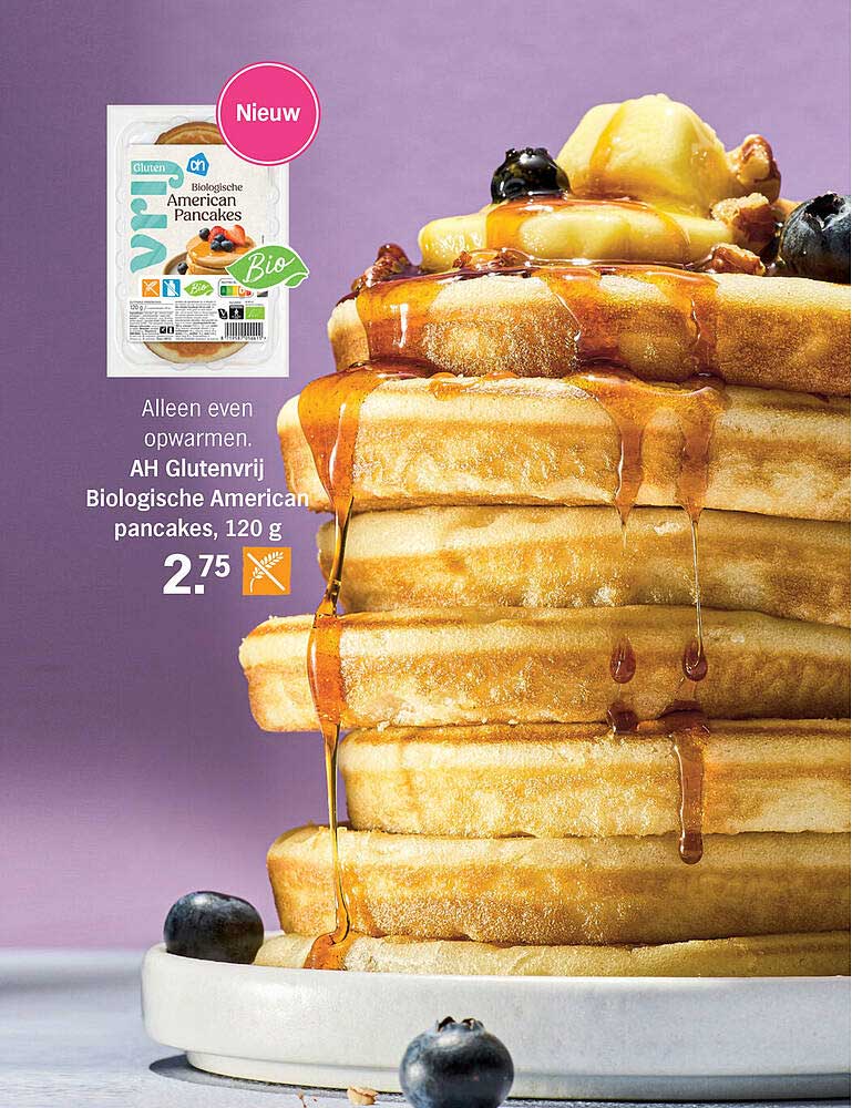 Bekijk nu de AH Glutenvrij Biologische American pancakes, 120 g aanbieding in de Albert Heijn folder. Deze aanbieding is geldig van 04-04-2025 tot en met 21-04-2025.