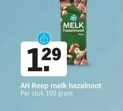 Ben je een liefhebber van chocolade? Dan is deze aanbieding op de AH Reep melk hazelnoot iets voor jou! Deze heerlijke reep met een romige melkchocoladebasis en knapperige stukjes hazelnoot biedt een smaakexplosie die je niet wilt missen. Perfect voor een tussendoortje of als traktatie na een lange dag. Waarom zou je jezelf niet verwennen met een lekkere snack die ook nog eens zeer betaalbaar is?