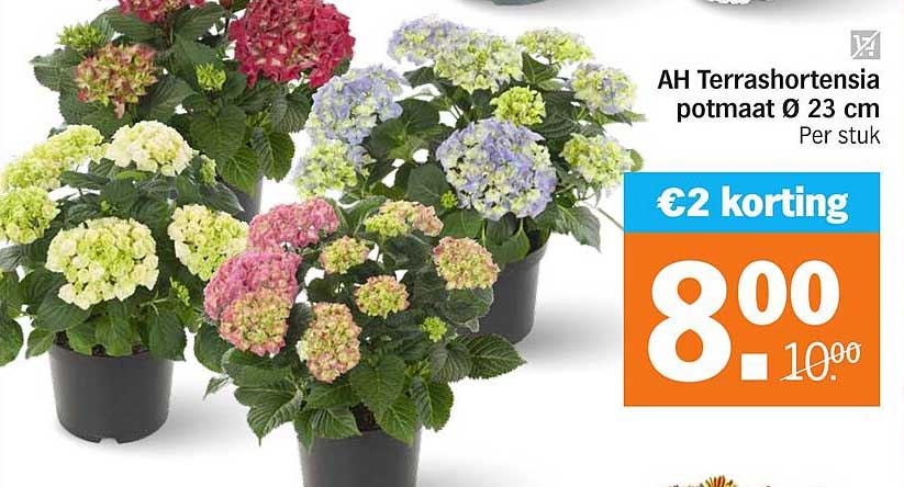 Ben je op zoek naar een prachtige toevoeging aan je tuin of balkon? Kijk dan niet verder! Deze week vind je een bijzondere aanbieding bij Albert Heijn: de AH Terrashortensia in potmaat Ø 23 cm. Met een korting van €2, koop je deze bloeiende schoonheid nu voor slechts €8,00. Dit is een uitgelezen kans om je buitenruimte op te fleuren met kleurrijke hortensia's.