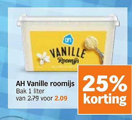 Bekijk nu de AH Vanille roomijs aanbieding in de Albert Heijn folder. Deze aanbieding is geldig van 21-07-2025 tot en met 27-07-2025.