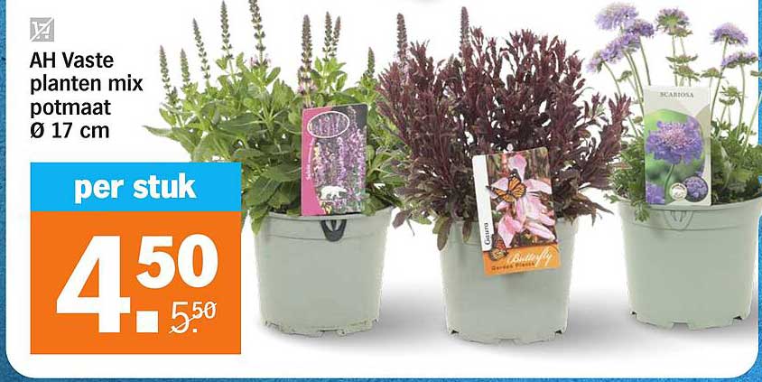 Neem snel een kijkje hier voor deze aanbieding en ontdek ook andere aantrekkelijke aanbiedingen in de Albert Heijn-folder. Maak van je buitenruimte een groene oase met de prachtige vaste planten van AH!